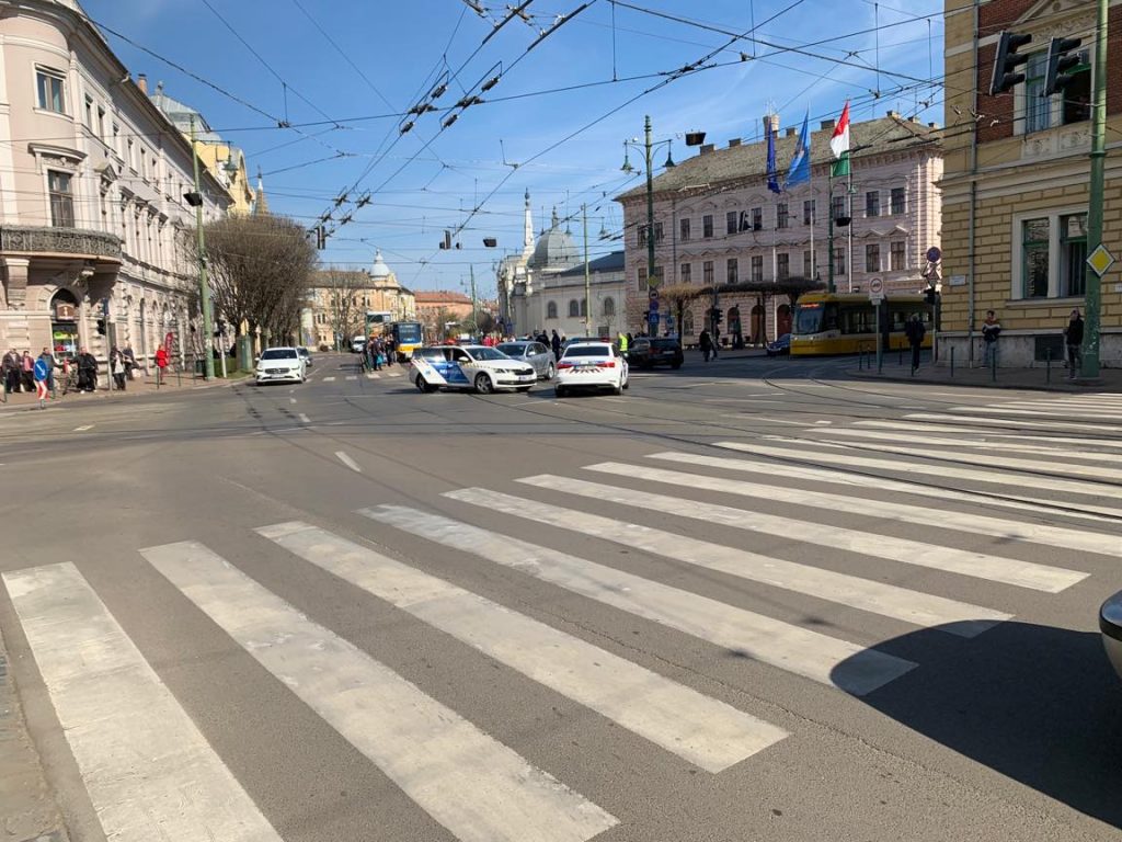 Frissítve! A Csongrád Megyei Rendőr-főkapitányság megkeresésünkre elmondta, hogy 2020. március 18-án 13 óra 21 perckor kaptak bejelentést arról, hogy Szegeden a Kossuth Lajos sugárút és a Tisza Lajos körút kereszteződésében egy autó a villamos sínekre hajtott, és ott megállt. Ezzel a villamos közlekedést megakadályozta.