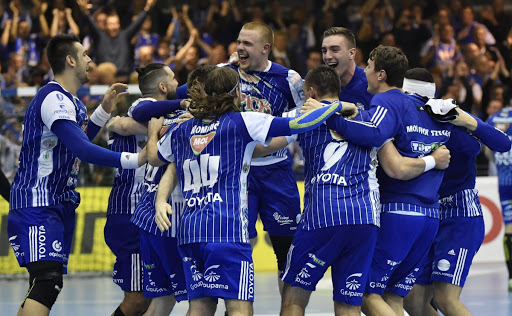 Veszprém, 2018. május 20. A bajnok Mol-Pick Szeged csapata ünnepel a férfi kézilabda NB I döntőjének visszavágó mérkőzése után a Telekom Veszprém otthonában, a Veszprém Arénában 2018. május 20-án. A szegedi csapat 29-26-ra kikapott a címvédő Telekom Veszprémtől, de összesítésben egyetlen góllal, 58-57-re jobbnak bizonyult riválisánál. MTI Fotó: Bodnár Boglárka