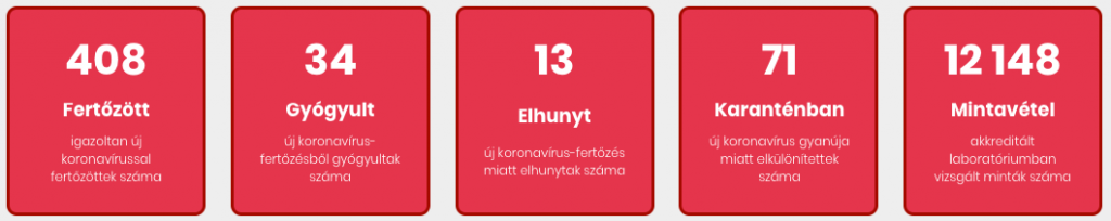 A hazánkban beazonosított új koronavírus-fertőzöttek száma: 408 fő. Közülük 10 iráni, 2 brit, 1 kazah, 1 vietnámi és 394 magyar állampolgár.