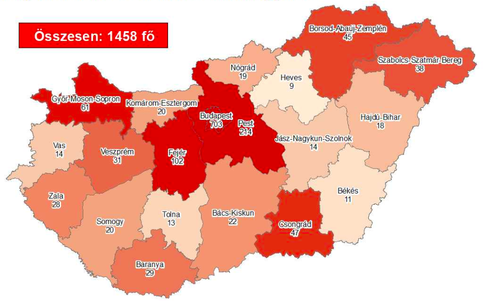 Fertőzöttek száma, országosan: 1458 fő