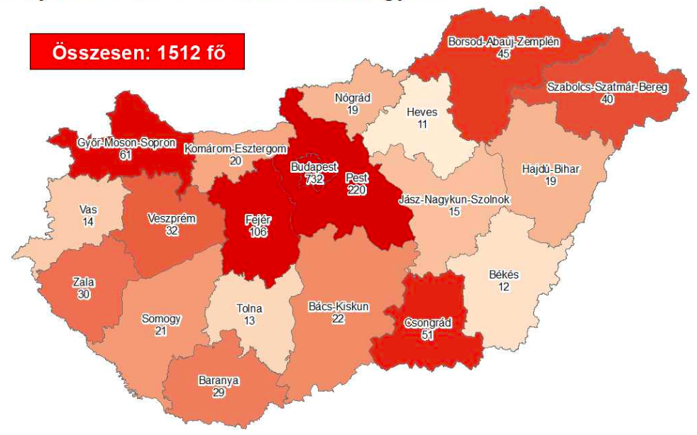 Fertőzöttek száma, országosan: 1512 (+54) fő