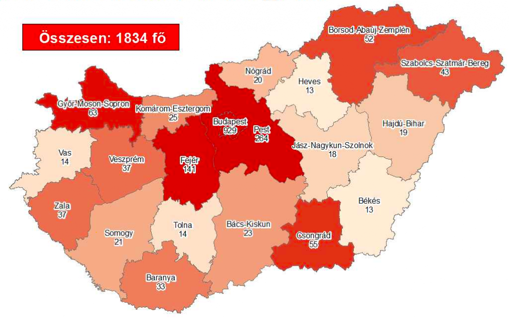 Fertőzöttek száma, országosan: 1834 (változás: +71) fő