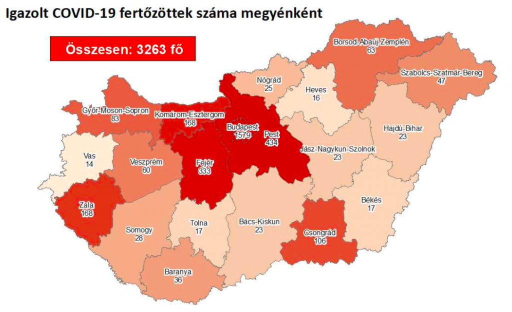 Újabb magyar állampolgároknál mutatták ki az új koronavírus-fertőzést (COVID-19), ezzel 3263 főre nőtt a hazánkban beazonosított fertőzöttek száma. Elhunyt újabb 8 idős krónikus beteg, 413 áldozatnál tart a járvány. Szegeden nem regisztráltak újabb fertőzöttet az előző 24 órában.