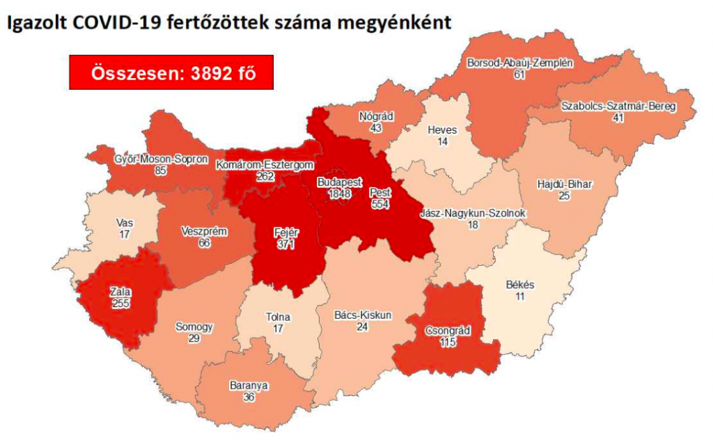 Fertőzöttek száma, országosan: 3892 (változás +15) fő