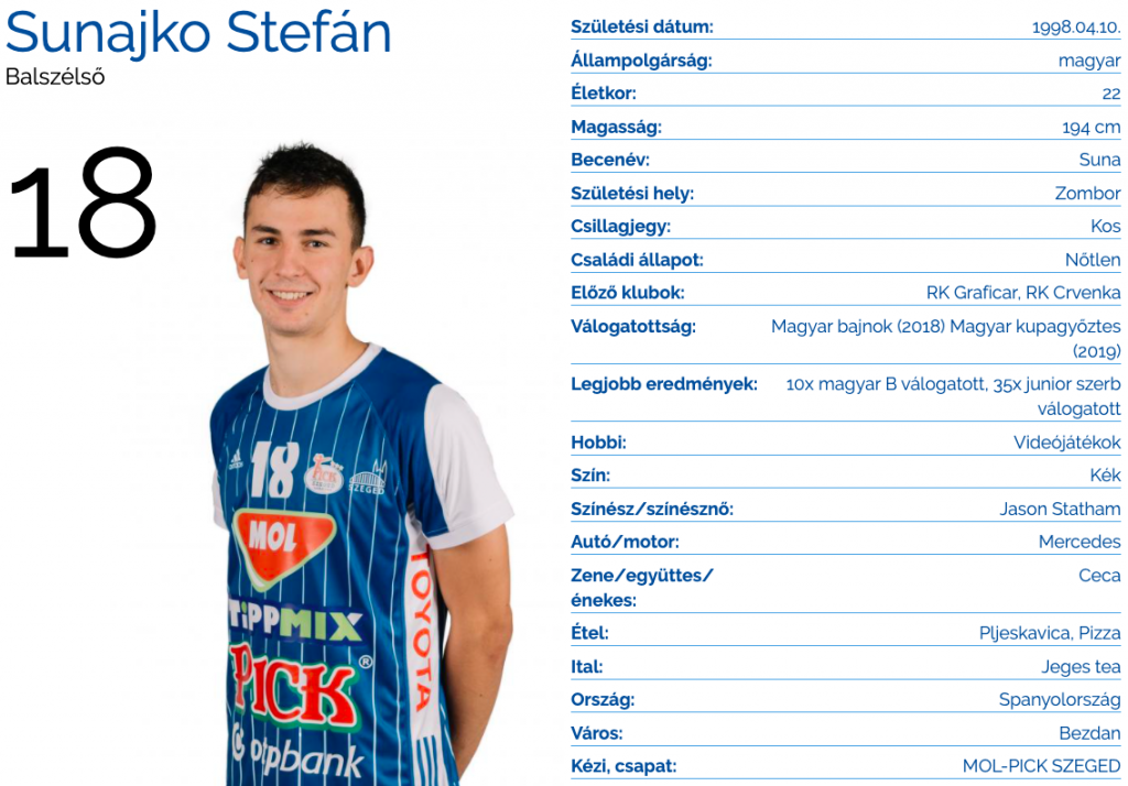 “Suna” (rossz az, aki rosszra gondol) barátunk a kézilabda mellett a teniszütővel is meglepően jól bánik: nemrég egy amatőr torna első helyezését is behúzta. A kettős (magyar és szerb) állampolgárságú balszélső a svéd Sävehofnál töltötte kölcsönben a koronavírus-járvány miatt félbeszakadt 2019–2020-as idényt, a következő szezontól pedig kétéves szerződést írt alá a Grundfos Tatabánya KC-hez. Az akkor 18 éves játékost még 2016 nyarán Szerbiából igazolta le a MOL-PICK Szeged.
