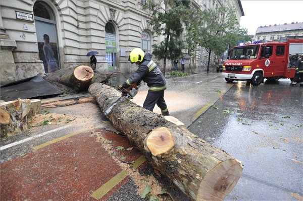 3.: Kidőlt fát távolítanak el tűzoltók a belvárosi Alkotmány utcában. A Budapestet is érintő viharos időjárás miatt fél óra alatt több mint hetven helyszínre riasztották a tűzoltókat.