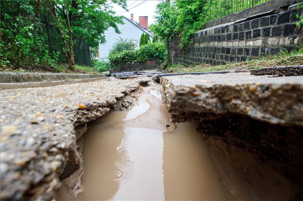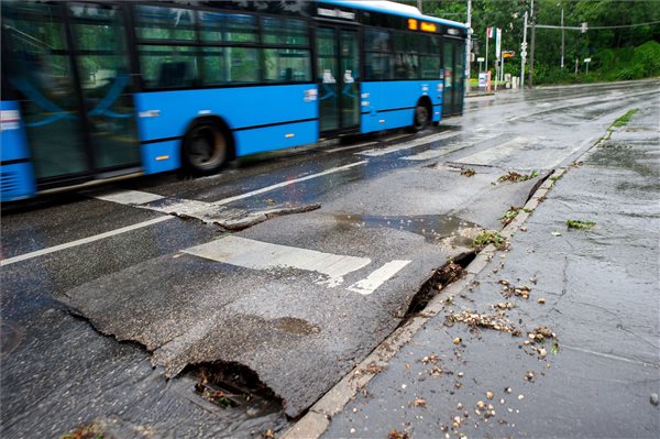 Még mindig Budapest. A nagy mennyiségű csapadékvíztől felszakadt útburkolat a XII. kerületi Istenhegyi úton: