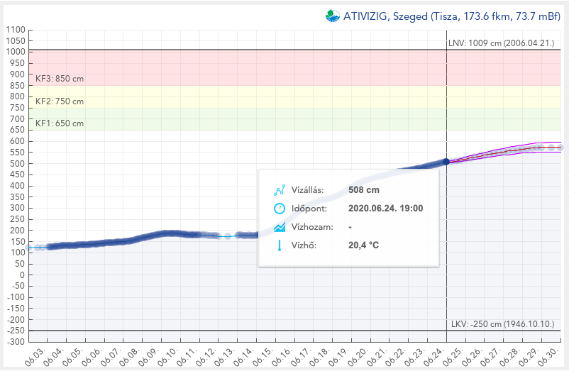 A Belügyminisztérium vízügyi főigazgatósága szerint ma este (2020.06.24., 19:00) a Tisza Szegednél 508 cm – nél van, hogy lesz-e nálunk árvíz, még nem tudni (a heves, júniusi esőzéseknek úgy fest, vége), azonban a Felső-Tiszán már elsőfokú készültség van érvényben. Szabó Dávid kollégánk kiugrott a rakpartra, mutatjuk, mi a helyzet!