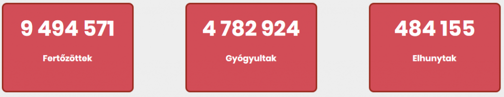 Egy nappal korábban a fertőzöttek száma még 9 408 757 volt, a halálos áldozatoké 482 184, a gyógyultaké pedig 4 729 511.