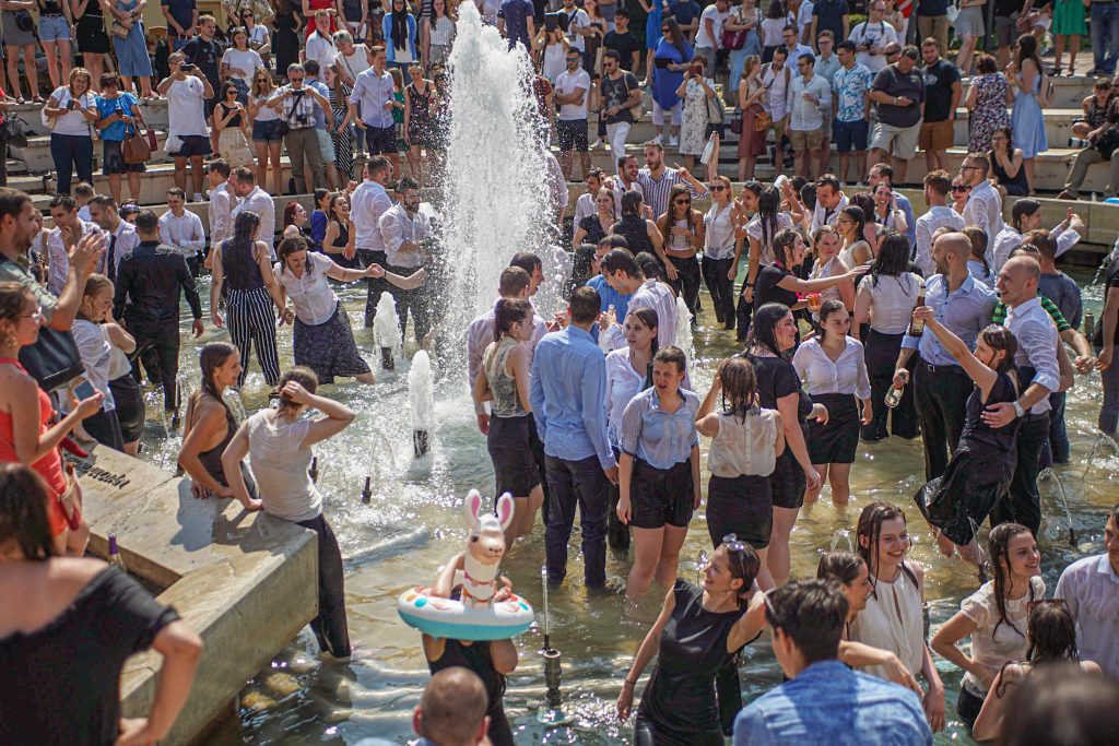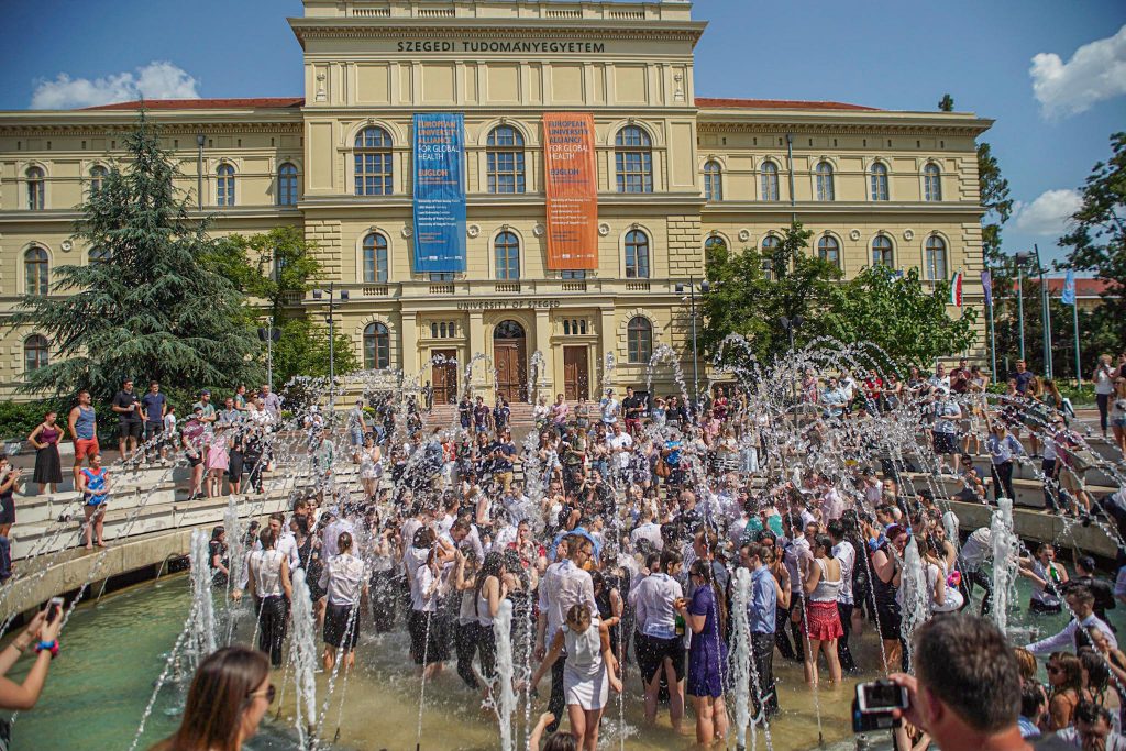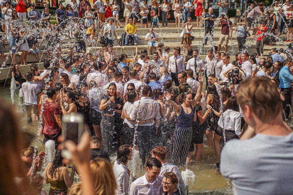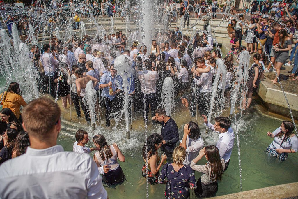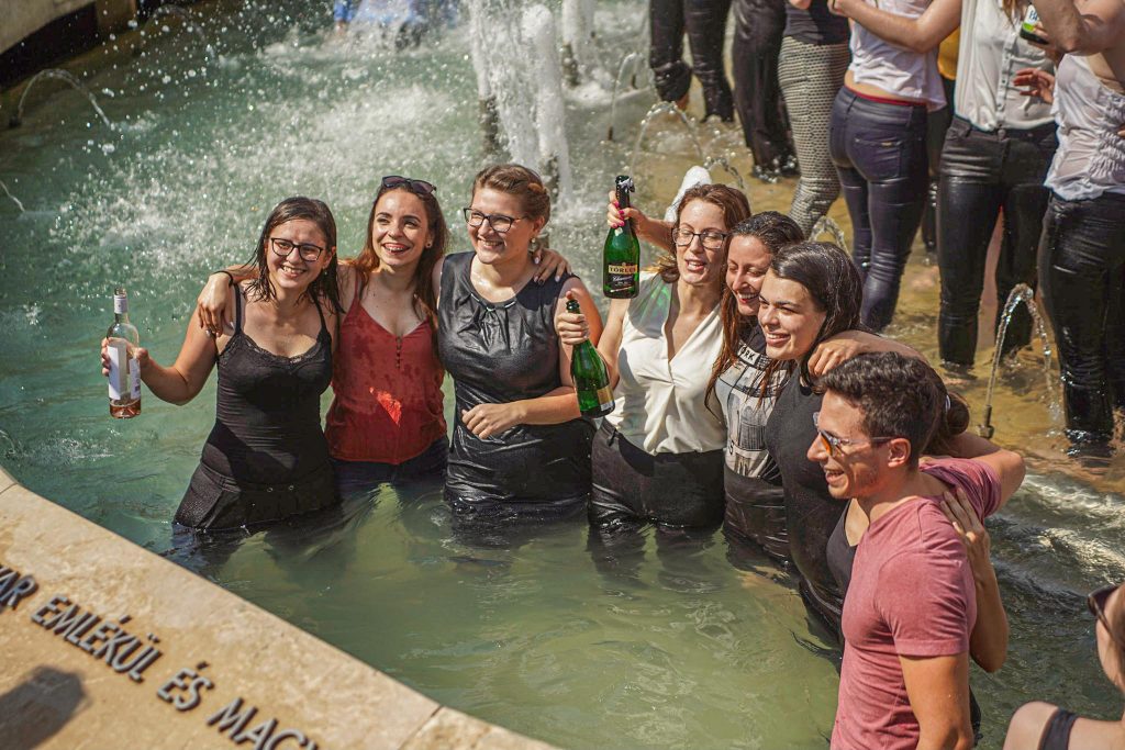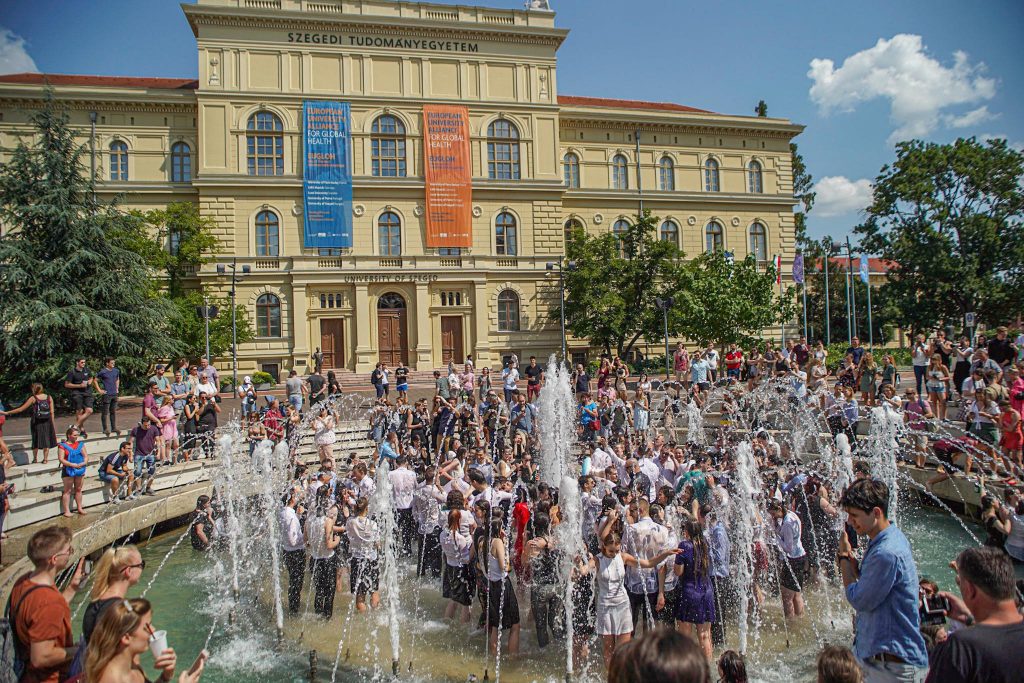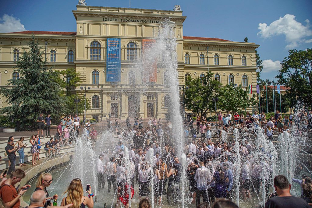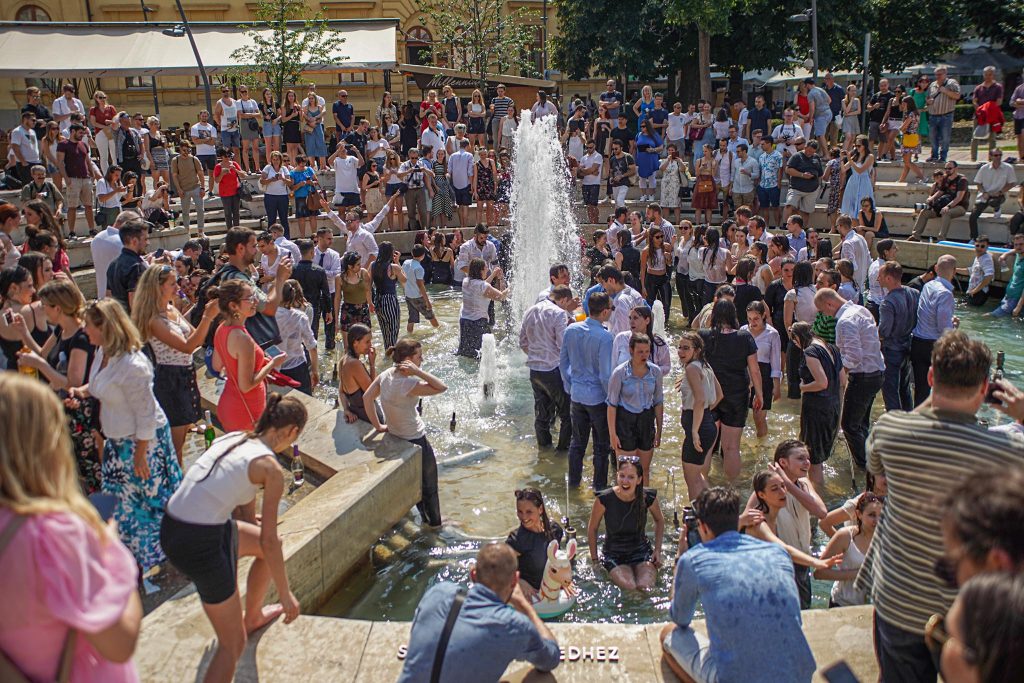 Szeged365 fotóriport: így fürödtek az SZTE frissen végzett orvostanhallgatói a Dugonics téri szökőkútban