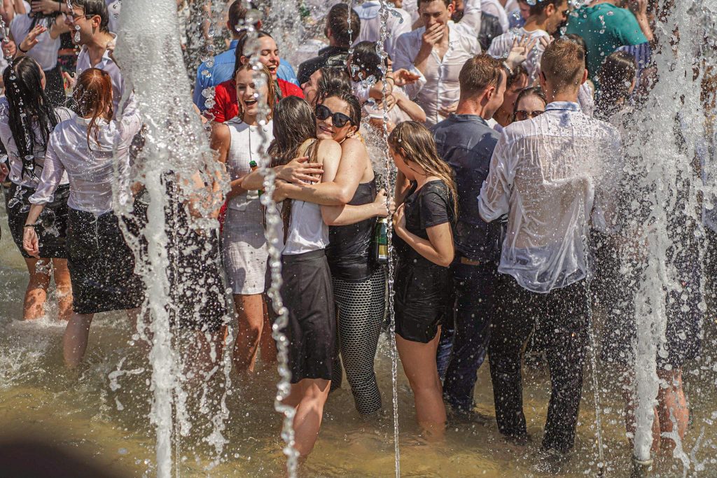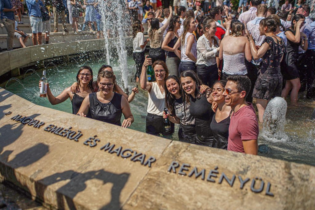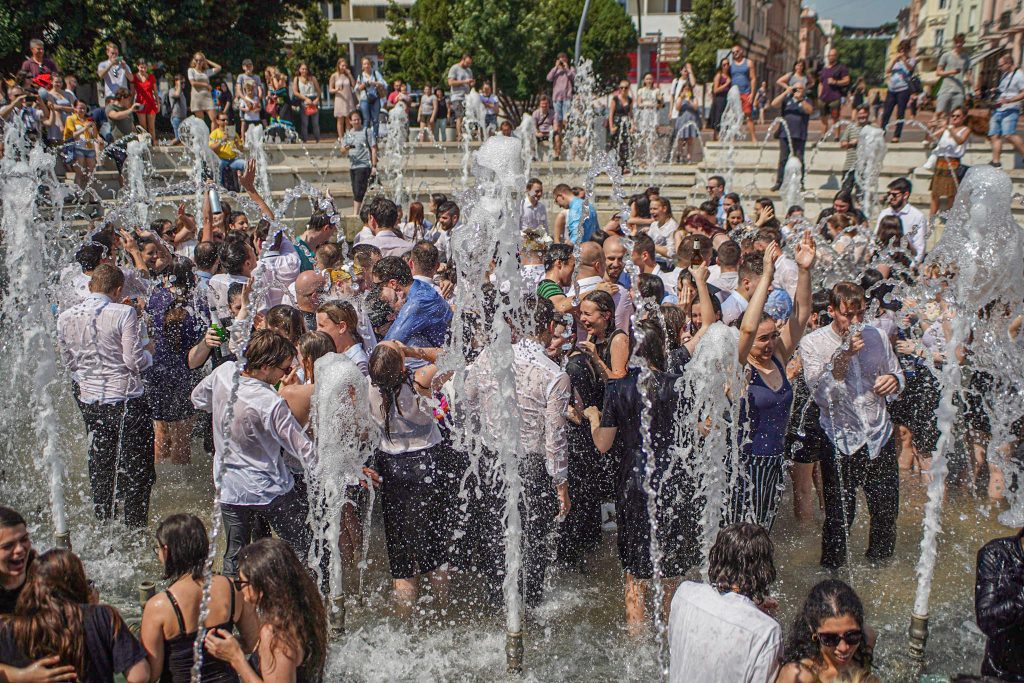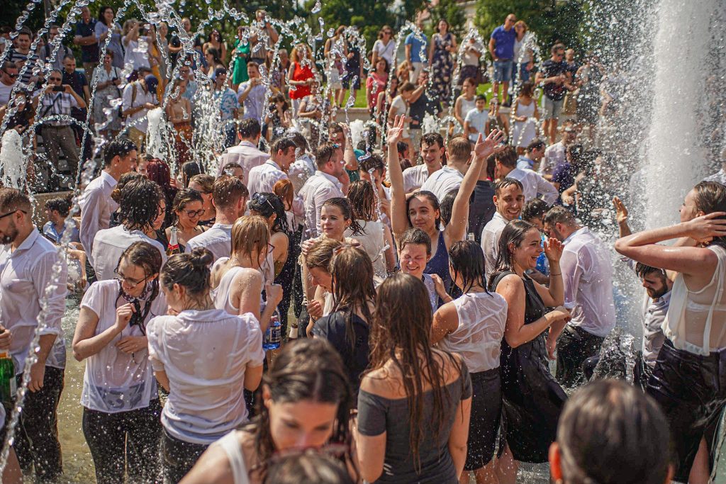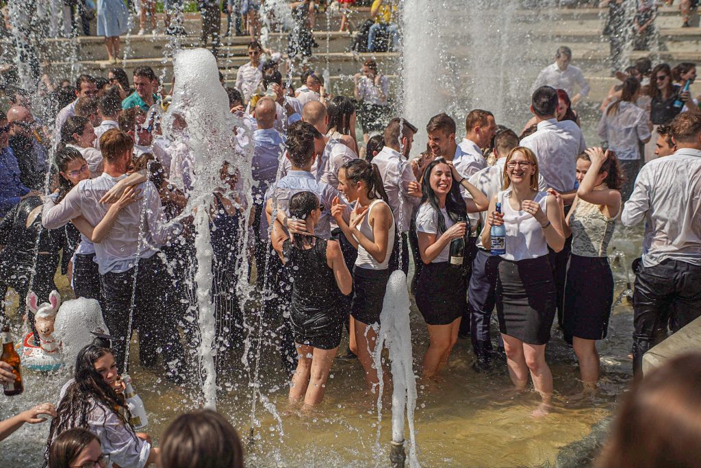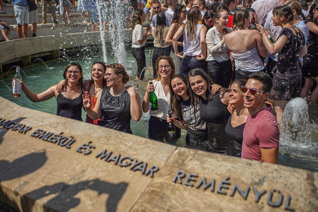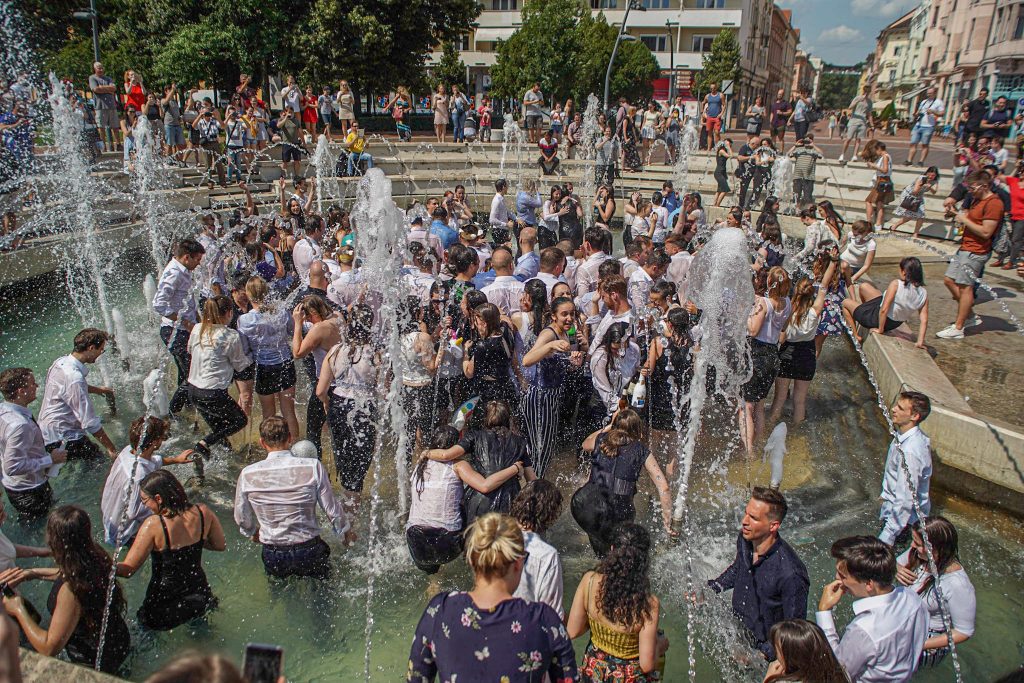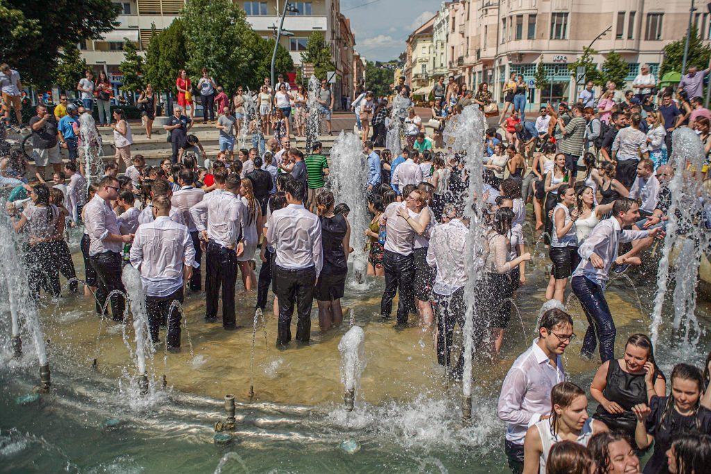 Szeged365 fotóriport: így fürödtek az SZTE frissen végzett orvostanhallgatói a Dugonics téri szökőkútban