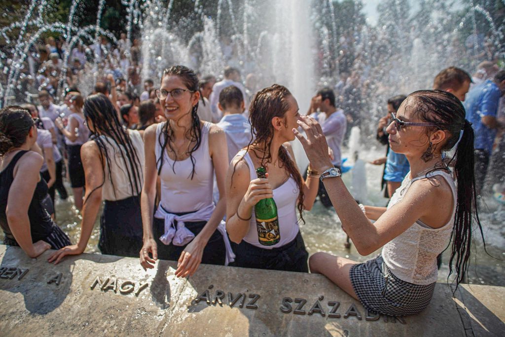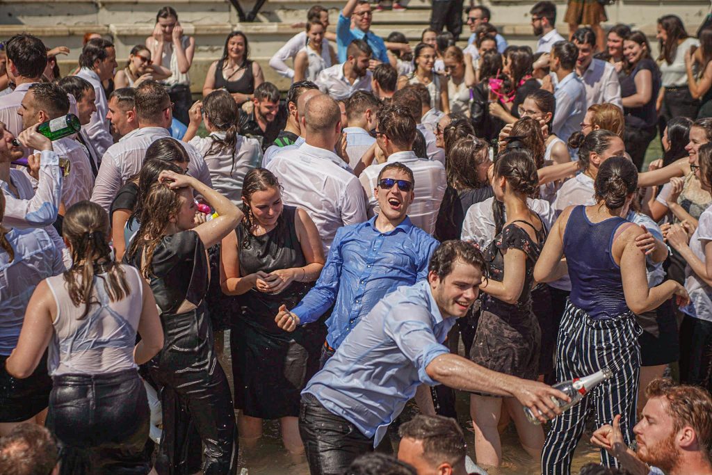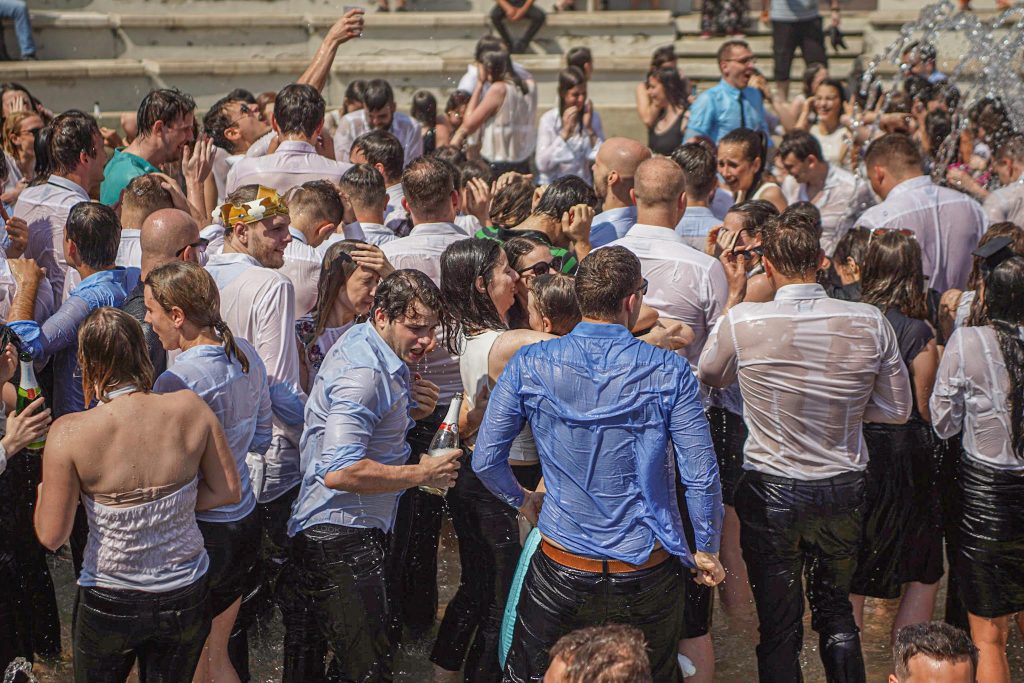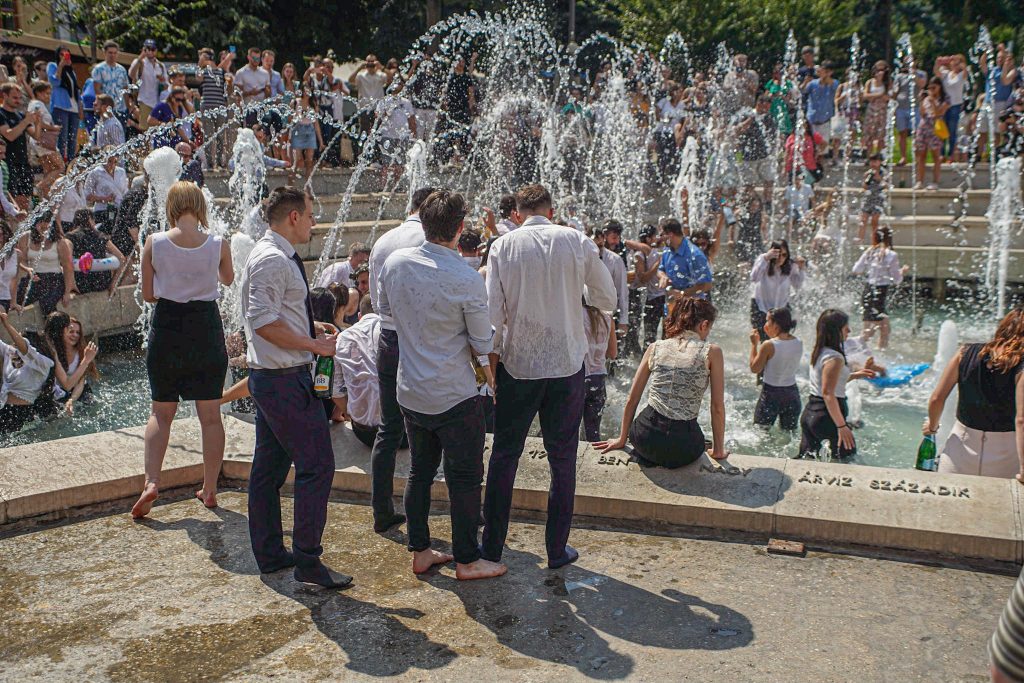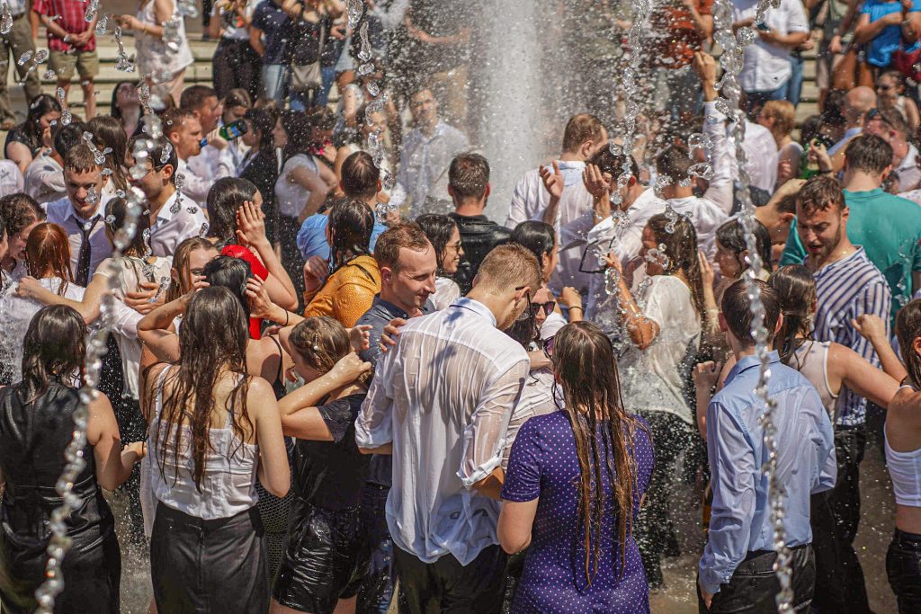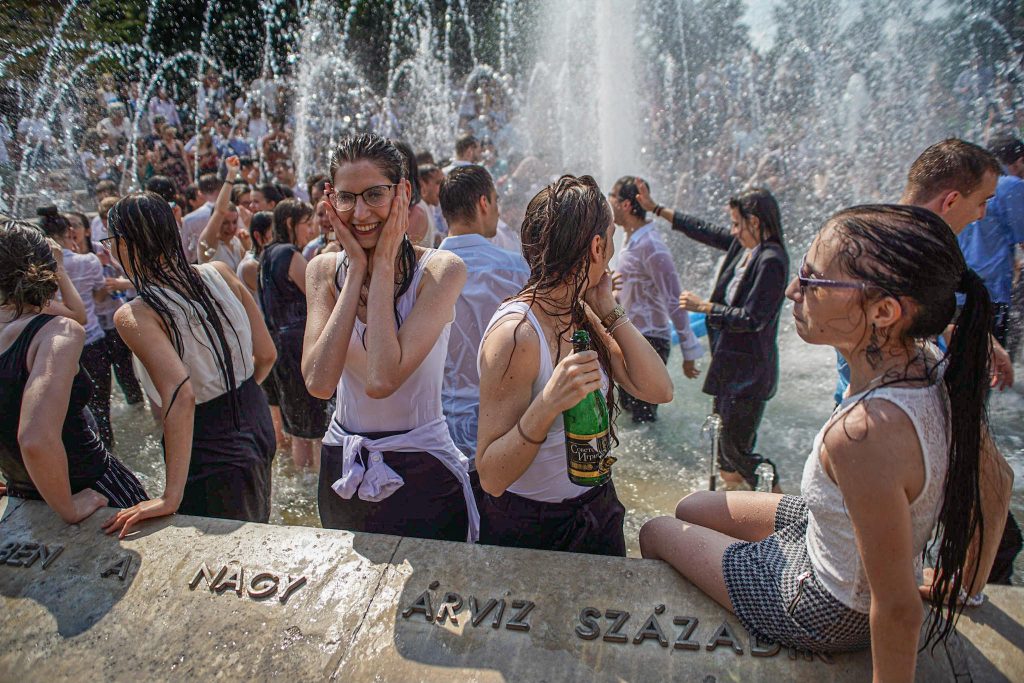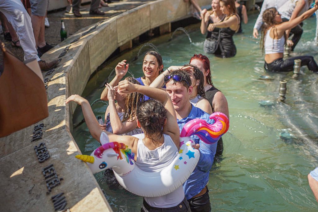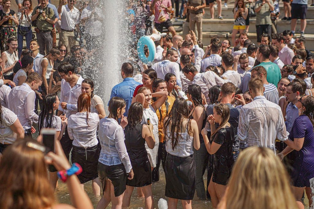 Szeged365 fotóriport: így fürödtek az SZTE frissen végzett orvostanhallgatói a Dugonics téri szökőkútban