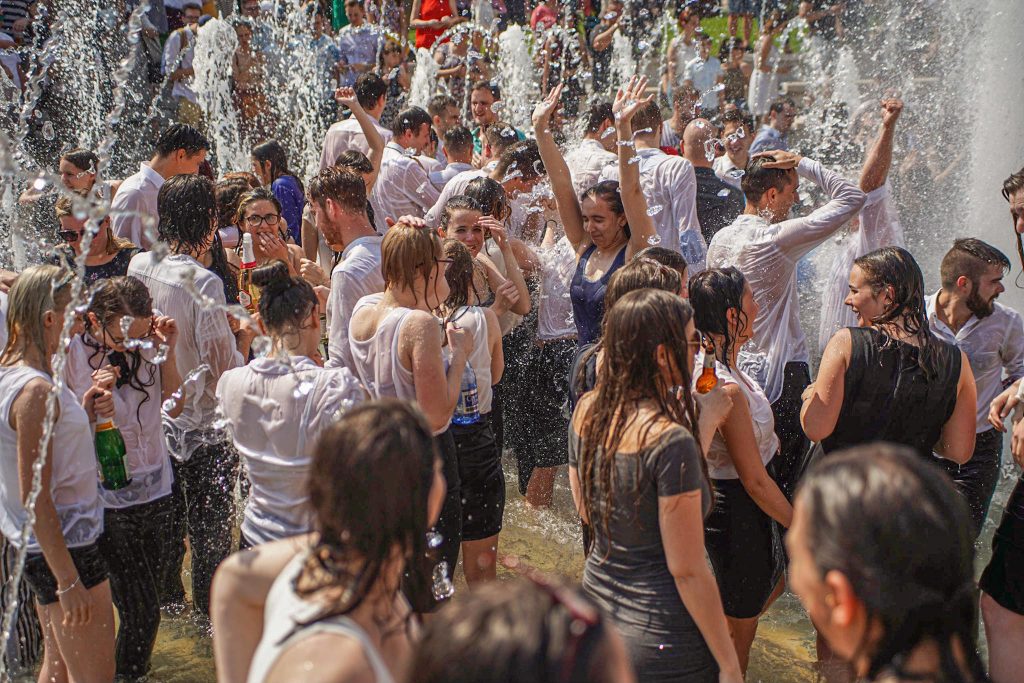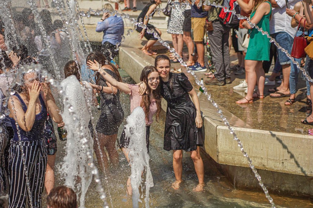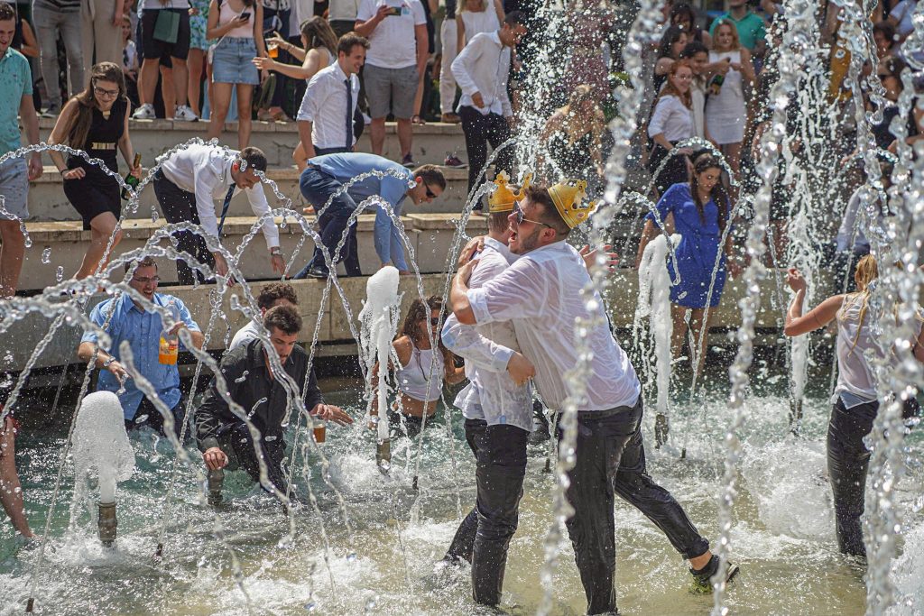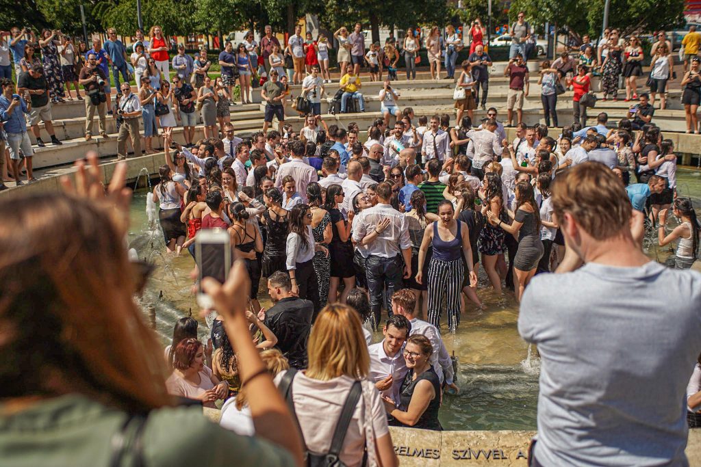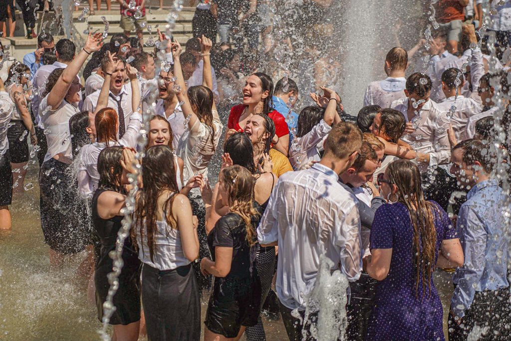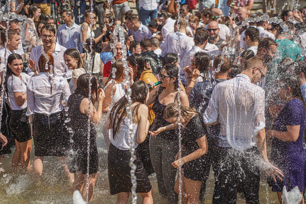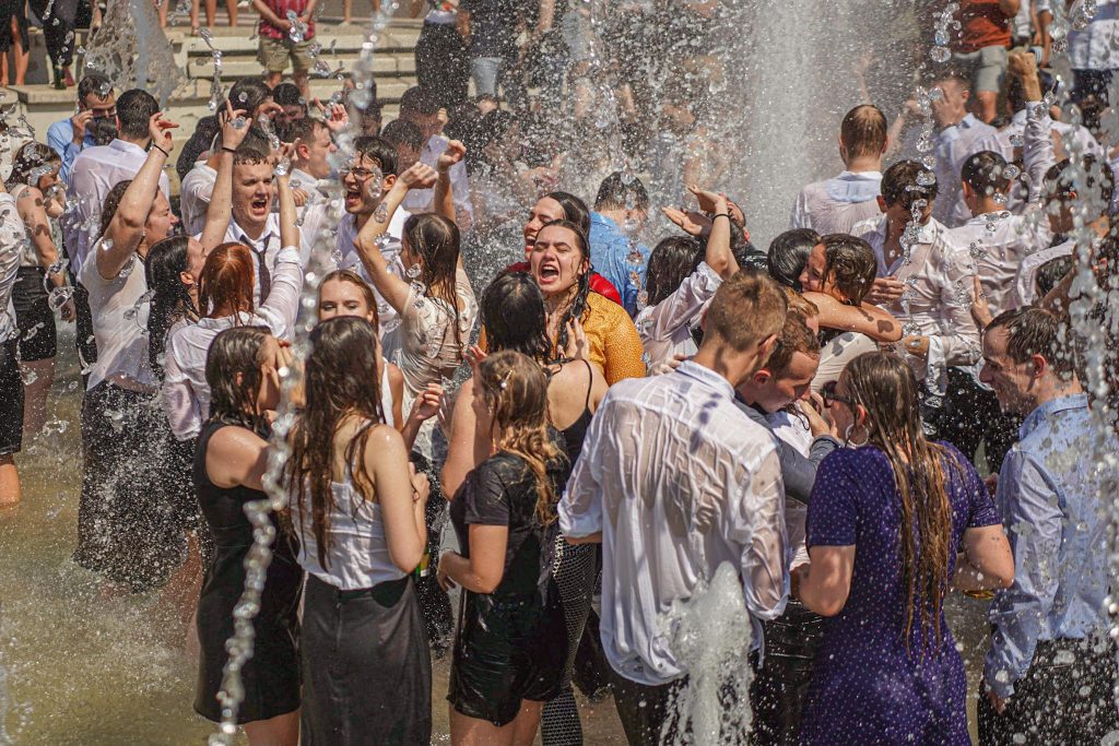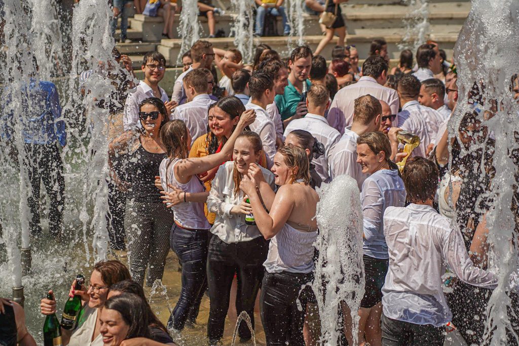 Szeged365 fotóriport: így fürödtek az SZTE frissen végzett orvostanhallgatói a Dugonics téri szökőkútban