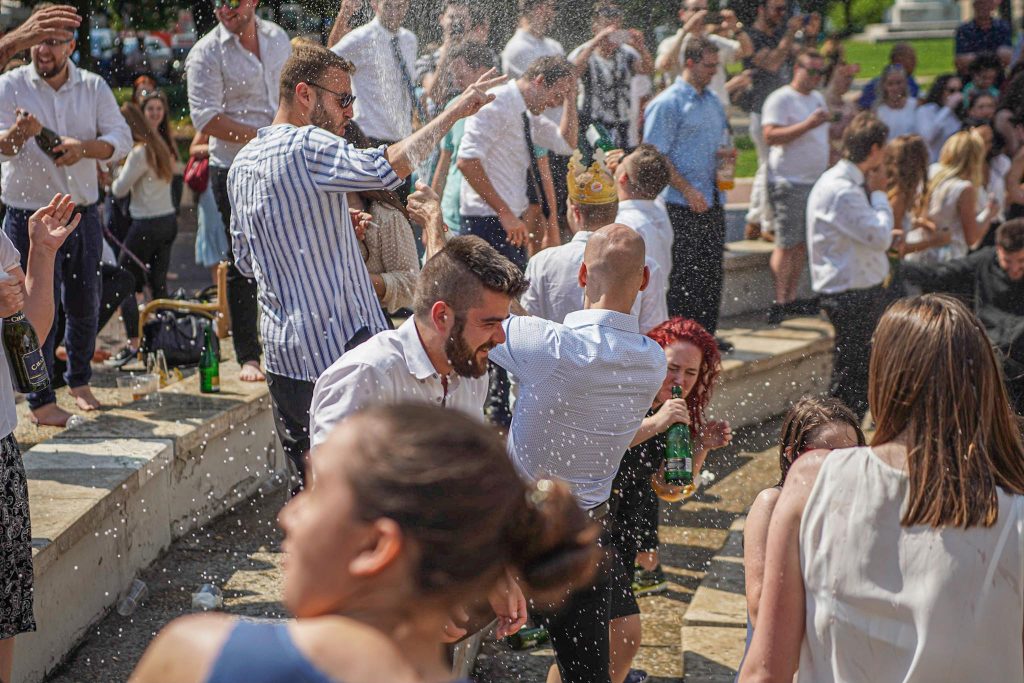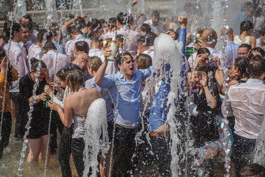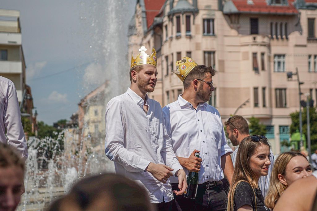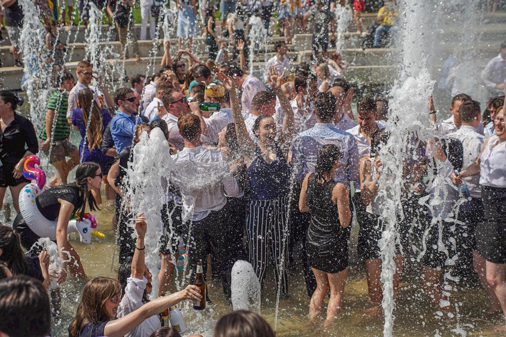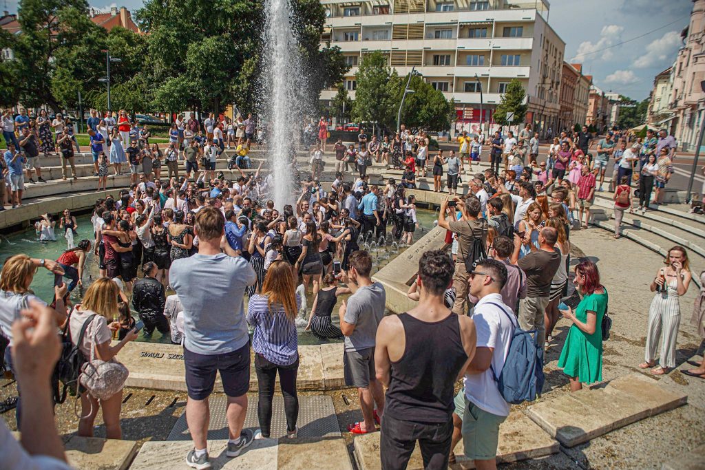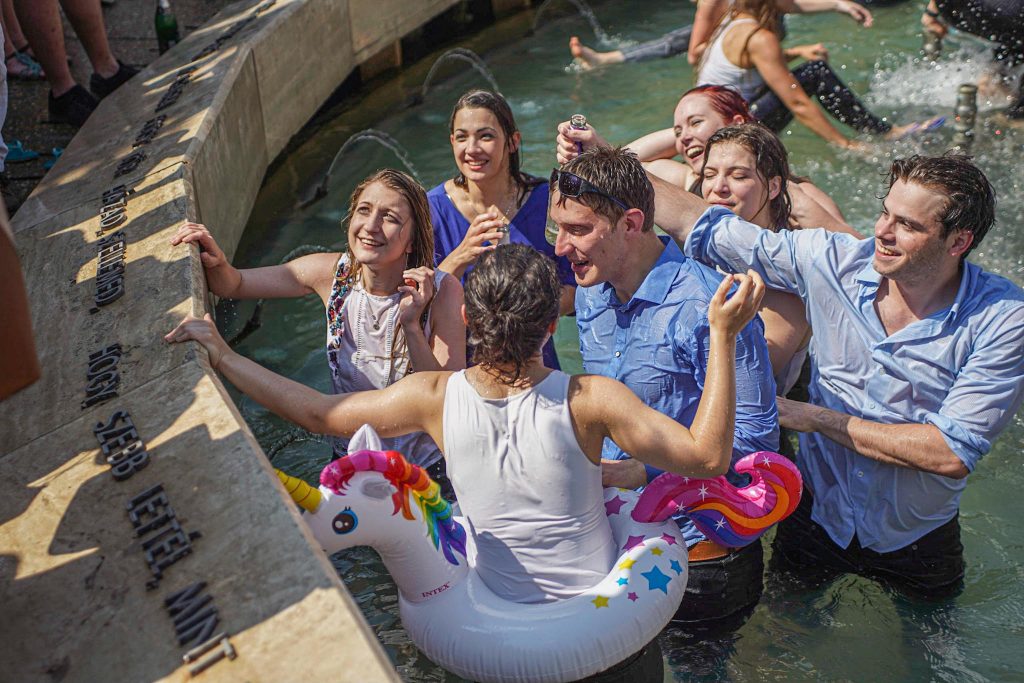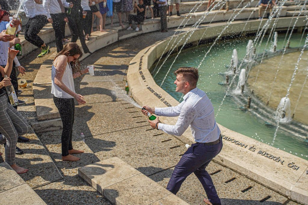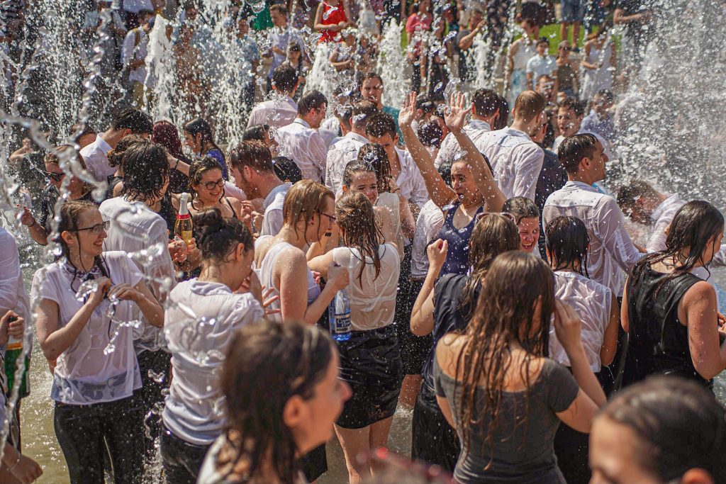 Szeged365 fotóriport: így fürödtek az SZTE frissen végzett orvostanhallgatói a Dugonics téri szökőkútban