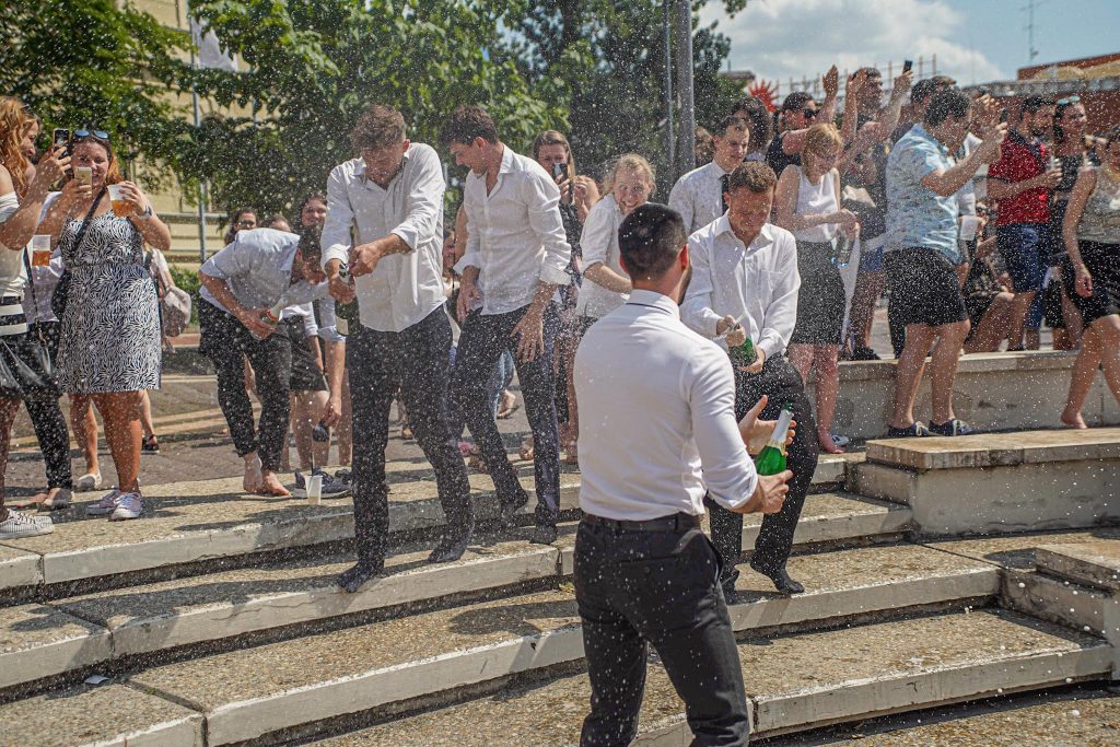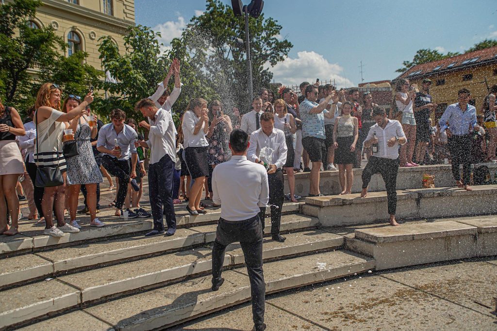 Az immár doktori titulussal rendelkező fiatalok jó, szegedi szokáshoz híven megmártóztak a Dugonics téri szökőkútban, ahol az örömteli pillanatokat Szabó Dávid kollégánk kapta lencsevégre. Gratulálunk és sok sikert kívánunk a Szeged újdonsült orvosainak!