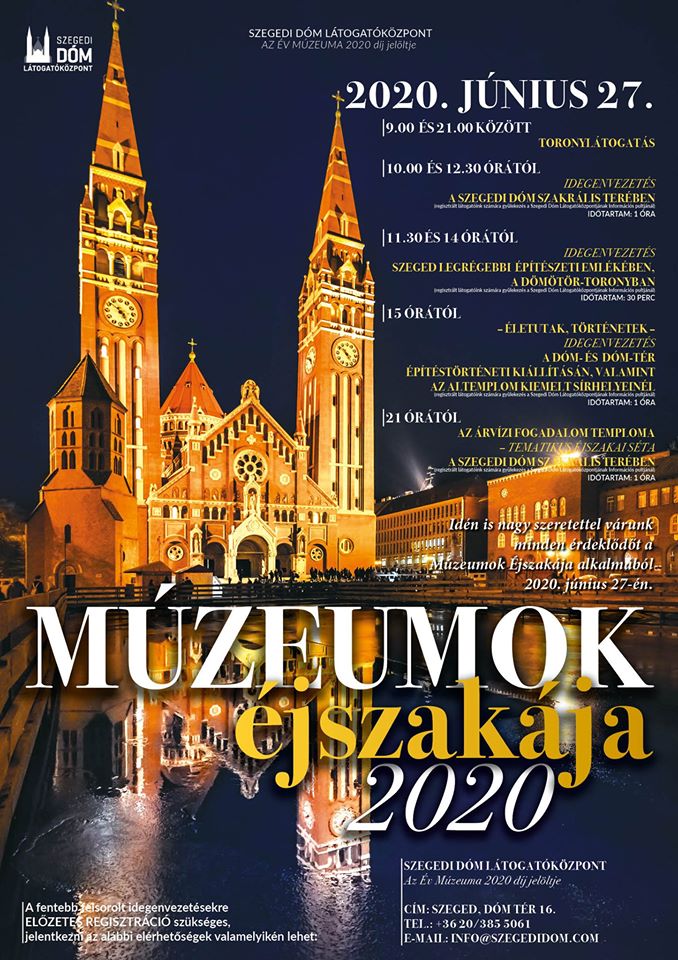 A Múzeumok Éjszakája alkalmából a a Szegedi Dóm Látogatóközpont reggel 9:00 és este 21:00 óra között közel egy tucat, ingyenes programmal várja a szegedieket. Többek között: Idegenvezetés a Dóm szakrális terében és a a Dömötör-toronyban, különböző életutak, történetek ismertetése de még egy éjszakai sétára is lehetőség nyílik, a részvétel pedig minden programnál regisztrációhoz kötött. A Szegedi Dóm Látogatóközpont egyébként és nem utolsósorban Az Év Múzeuma 2020 díj jelöltje, ez pedig azt jelenti, hogy nem fogsz csalódni, remek élményeben lesz részed! Tudnivalók a képre kattintva: