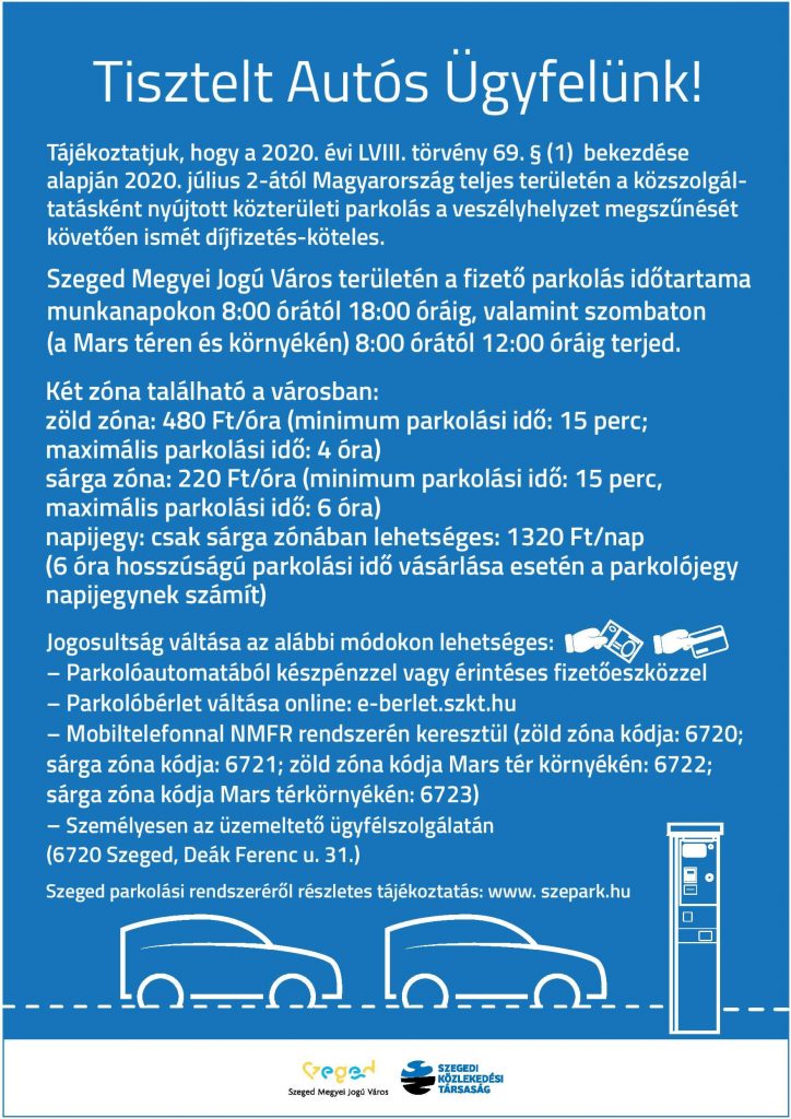 A Szegedi Közlekedési Társaság közleménye szerint Magyarország teljes területén, így Szegeden is visszaáll a fizetős parkolás. A városban munkanapokon 8 és 18 óra között, szombaton a Mars téren és környékén pedig 8 és 12 óra között kell majd fizetni. A zöld zónában 480 Ft, a sárga zónában 220 Ft a várakozás díja. Az autóval közlekedők, parkolók tájékoztatása érdekében egy figyelemfelhívást is kihelyeznek minden parkolóautomatára.
