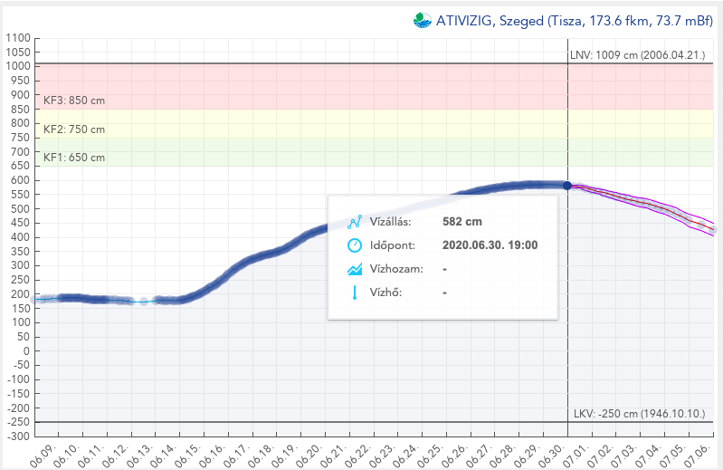 Az elmúlt tíz nap alatt közel 200 centimétert emelkedett a Tisza vízszintje Szegeden és környékén, ebben a szent minutumban 582 cm a vízállás a Napfény Városánál, ugyanez a szám Mindszentnél 595, Algyőnél 609 cm.