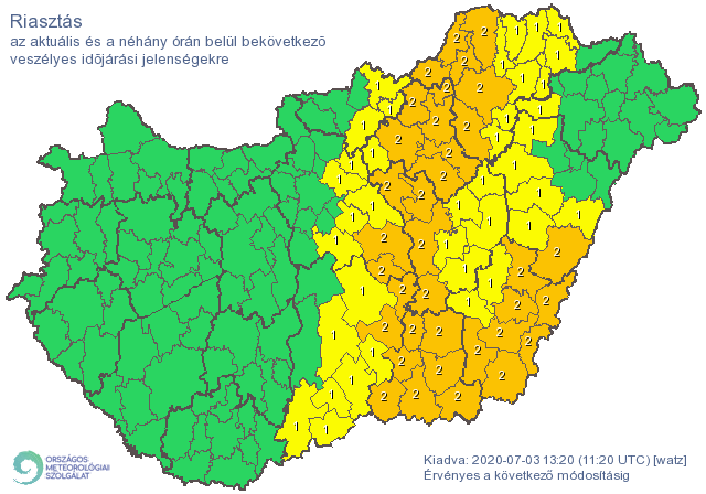 A veszélyjelzés szerint a felhőszakadás veszélye miatt Békés, Borsod-Abaúj-Zemplén, Csongrád-Csanád, Hajdú-Bihar, Heves, Jász-Nagykun-Szolnok, Szabolcs-Szatmár-Bereg megyében van érvényben másodfokú figyelmeztetés. Budapestre, Pest, Baranya, Bács-Kiskun, Nógrád és Tolna megyére elsőfokú figyelmeztetést adtak ki.