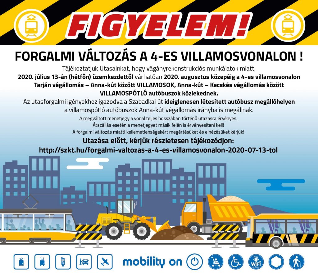 Július 13-án, tehát ma vágányrekonstrukciós munkálatok miatt változik a 4-es villamos forgalmi rendje, melynek köszönhetően a 4-es villamosvonalon Tarján végállomás és az Anna-kút között villamosok, ám az Anna-kút és Kecskés végállomás között villamospótló autóbuszok közlekednek majd. A munkálatok várhatóan augusztus közepéig tartanak, ismertette az SZKT.