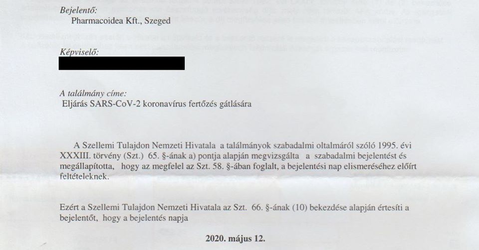 A Facebook poszthoz a szegedi kutatóorvos egy, a Szellemi Tulajdon Nemzeti Hivatala által májusban Dr. Letoha cégének, a Pharmacoidea Kft-nek kiadott értesítőt is csatol, amelynek témája “Eljárás SARS-COV-2 koronavírus fertőzés gátlására” – adva választ arra, hogy Dr. Kemenesi álszakértőnek titulálta szegedi társát az interjúnkra reagálva.