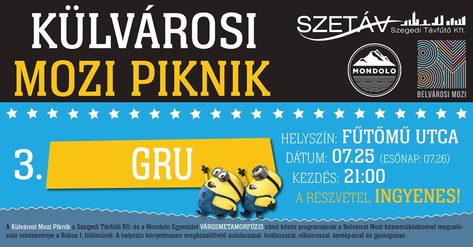 A bolondos időjárásra való tekintettel a Belvárosi Mozi, a Mondolo Egyesület és a SZETÁV kooperációjaként létrejött szabad ég alatt való mozizás tegnap elmaradt, ám a szervezők ma mindent bepótolnak! Jön tehát a a világpusztító tervekkel felvértezett Gru és csetlő-botló segédhadserege, a mindig vicces minyonok. Kezdés 21:00 óra, Fűtőmű utca!