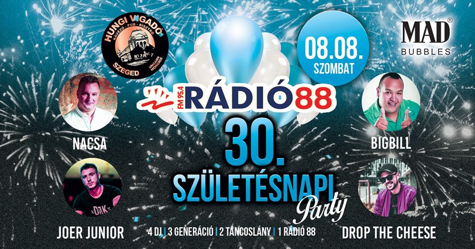 Ha Rádió 88 szülinap, akkor orbitális elhajlá… khm, buli a Hungiban. Szombat este ünnepli a 30. szülinapját a rádió, ami legalább annyira szegedi, mint a papucs, a paprika vagy a halászlé.