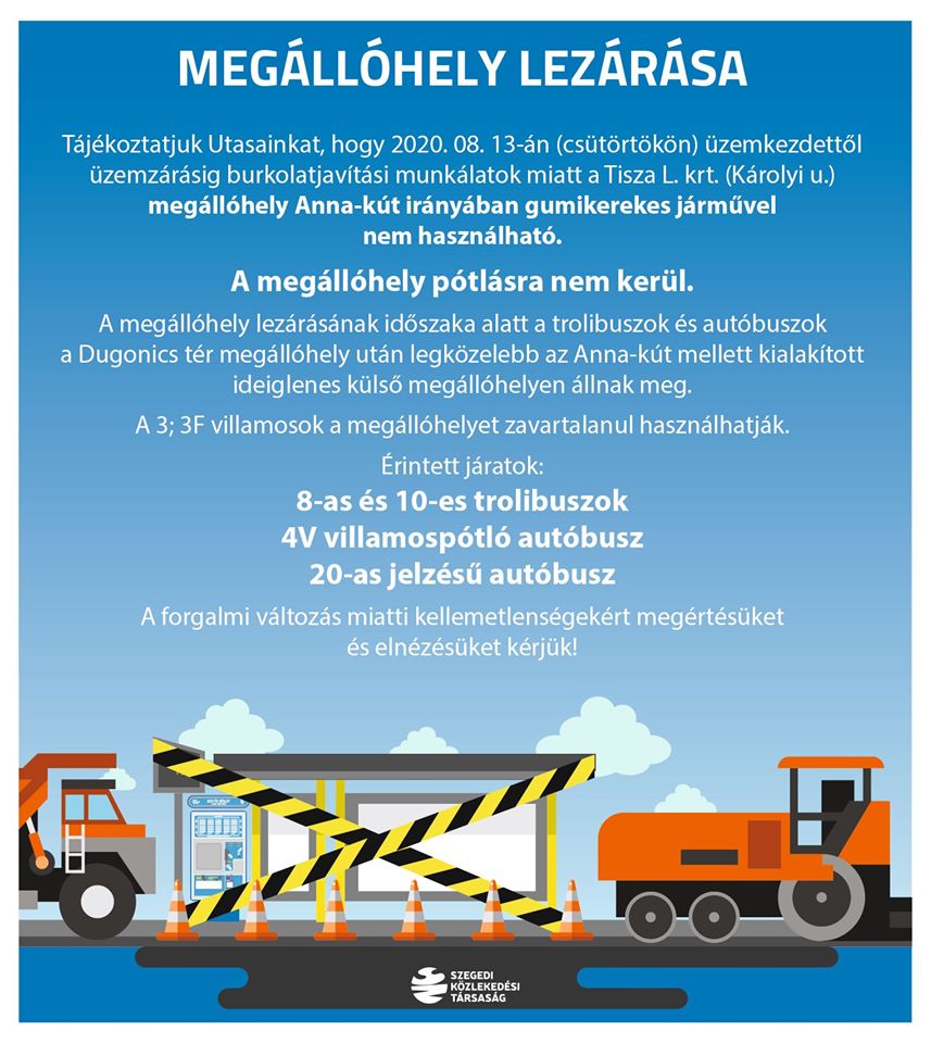 Csütörtökön, azaz augusztus 13-án lezárják a Tisza Lajos körút és az Anna-kút közötti megállóhelyet. Ez idő alatt a trolibuszok és autóbuszok a Dugonics tér megállóhely után legközelebb az Anna-kút mellett kialakított ideiglenes külső megállóhelyen állnak meg.