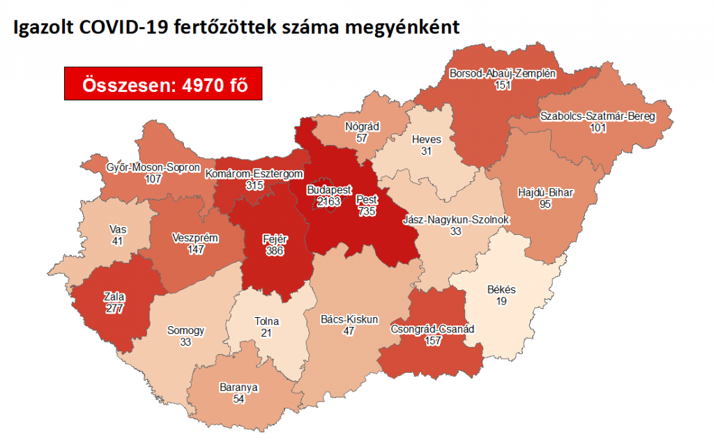 Regisztrált fertőzöttek száma, országosan: 4970 (változás +24) fő