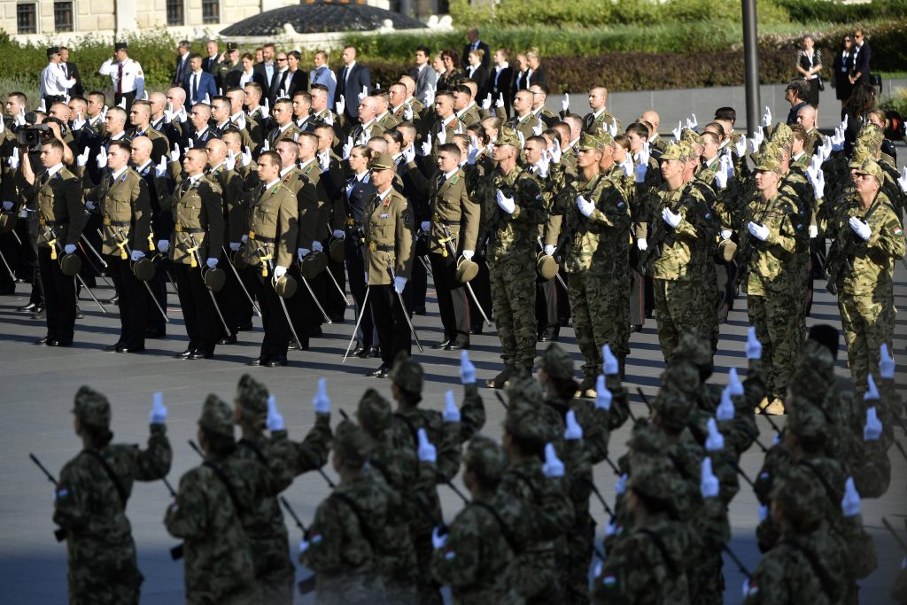 Katonai tiszteletadás mellett, Áder János államfő, Orbán Viktor kormányfő és Kövér László házelnök jelenlétében felvonták Magyarország nemzeti lobogóját az augusztus 20-ai állami ünnepen csütörtök reggel Budapesten, a Parlament előtti Kossuth Lajos téren.