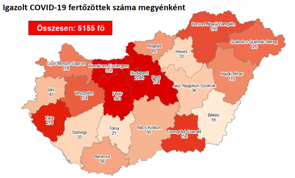 Regisztrált fertőzöttek száma, országosan: 5155 (változás +22) fő
