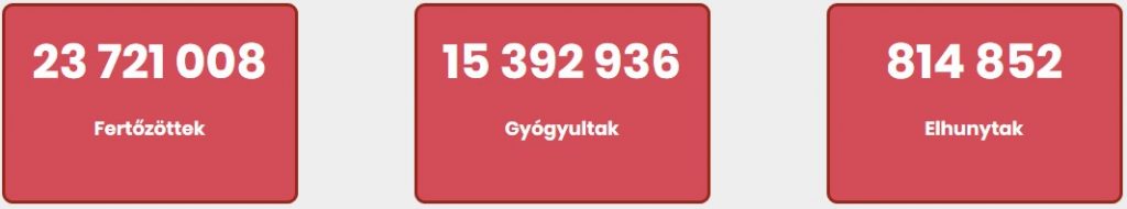 Már több mint 23,9 milliónyian fertőződtek meg, egy nap alatt 6297-en haltak meg. Eddig 23 901 014 ember fertőződött meg világszerte a koronavírus-járványban, a halálos áldozatok száma 819 554, a gyógyultaké pedig 15 580 538 a baltimore-i Johns Hopkins Egyetem szerda reggeli összesítése szerint.