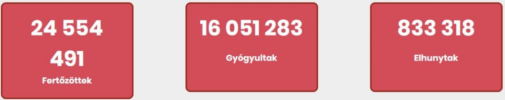 Már több mint 24,6 millió ember fertőződött meg, 16,1 millióan pedig felépültek a kórból. Eddig 24 649 431 ember megfertőződött világszerte a koronavírus-járványban, a halálos áldozatok száma 835 793, a gyógyultaké pedig 16 121 236 a baltimore-i Johns Hopkins Egyetem szombati reggeli összesítése szerint.