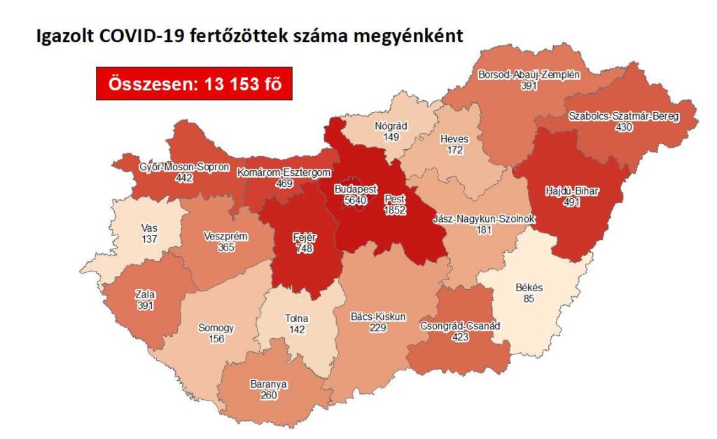 Regisztrált fertőzöttek száma, országosan: 13 153 (változás +844) fő