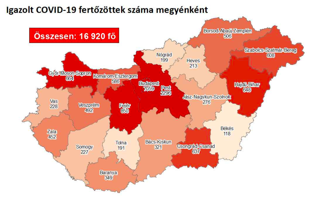Regisztrált fertőzöttek száma, országosan: 16.920 (változás +809) fő