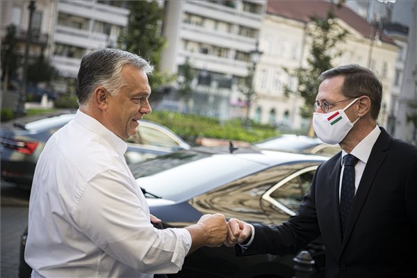 Budapest, 2020. szeptember 19. A Miniszterelnöki Sajtóiroda által közreadott képen Orbán Viktor miniszterelnököt (b) fogadja Varga Mihály pénzügyminiszter a Gazdaságvédelmi Operatív Törzs ülése előtt Budapesten 2020. szeptember 19-én. MTI/Miniszterelnöki Sajtóiroda/Benko Vivien Cher