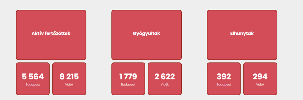 Az aktív fertőzöttek 40%-a, az elhunytak 57%-a, a gyógyultak 40%-a budapesti.