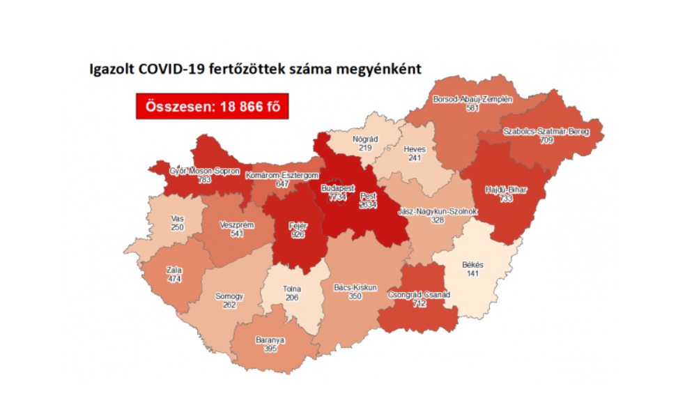 Regisztrált fertőzöttek száma, országosan: 18.866 (változás +876) fő