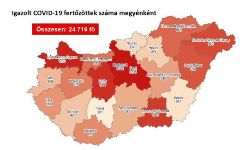 Regisztrált fertőzöttek száma, országosan: 24 716 (változás +702) fő
