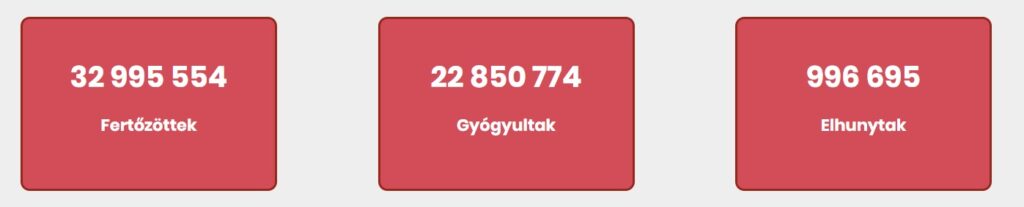 A világon 32 994 213 ember fertőződött meg a koronavírus-járványban, a halálos áldozatok száma 996 682, a gyógyultaké pedig 22 850 358 a baltimore-i Johns Hopkins Egyetem közép-európai idő szerint hétfő reggeli adatai szerint.