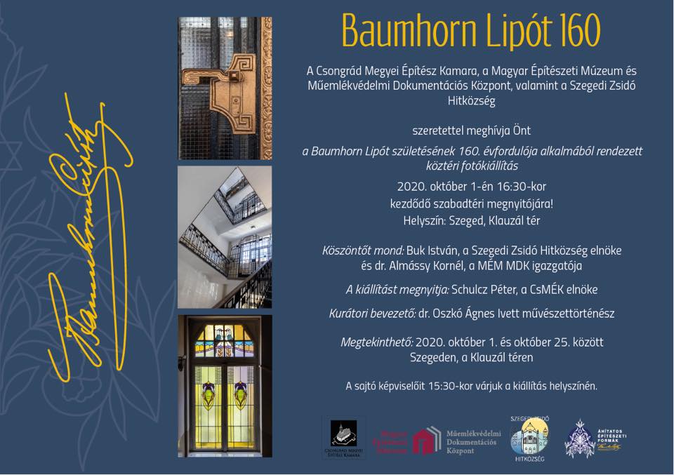 1860-ban, 160 éve született Baumhorn Lipót építész, aki korának legjelentősebb zsinagógatervezője volt. Huszonkét megvalósult épületével valóban ő építette a legtöbb zsinagógát Európában, maga mögött hagyva a műfaj osztrák és német specialistáit is. Összes zsinagógája a történelmi Magyarország területén áll vagy állt, és az 1888–1932 közé eső bő négy évtizedben készült. Legfontosabb művei az esztergomi, Temesvár–gyárvárosi, szolnoki, szegedi, brassói, újvidéki, losonci és gyöngyösi zsinagógák, de a fővárosban is négy épület fémjelzi nevét.