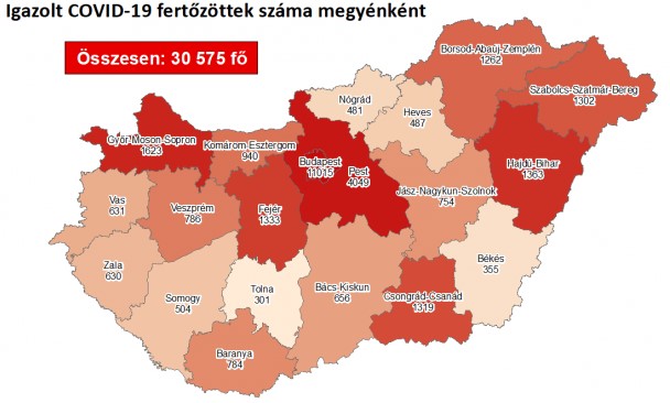 Regisztrált fertőzöttek száma, országosan: 30575 (változás +858) fő
