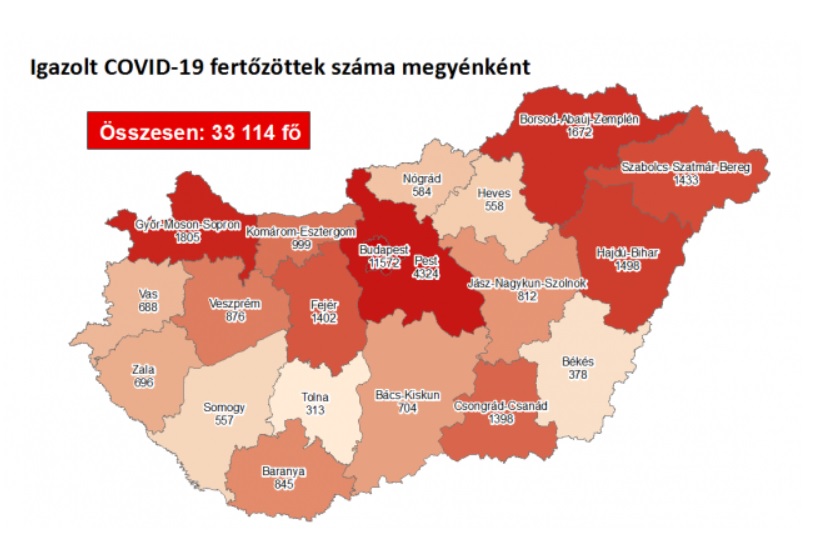 816 újabb magyar állampolgárnál mutatták ki az új koronavírus-fertőzést (COVID-19), ezzel 33 114 főre nőtt a hazánkban beazonosított fertőzöttek száma. Elhunyt 24 beteg – közülük tizenheten hetven év felettiek – így az elhunytak száma 877 főre emelkedett, 9149-en pedig már meggyógyultak. Az aktív fertőzöttek száma 23 088 fő. 656 koronavírusos beteget ápolnak kórházban, közülük 41-en vannak lélegeztetőgépen.
