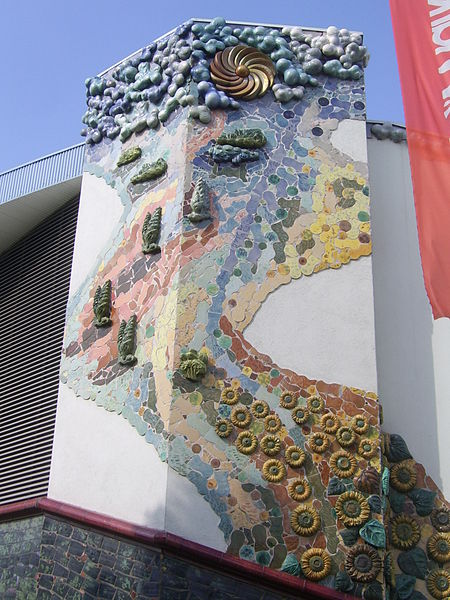 Kezdjük egy szubjektív kitérővel: nem az épület ronda (sőt, maga a forma még tetszik is), hanem Kungl György keramikus, szobrász mázas kerámia épületplasztikája kelt egy kicsit bizarr hatást. A dekoráció elviekben nyári dűlőt, őszi szántót és tarlót ábrázol, a gyakorlatban viszont inkább valamiféle gombás burjánzáshoz emlékeztet (de lehet, hogy csak bennünket). Mindez hatványozottan igaz, ha távolról, felületesen szemléled a “kompozíciót” – a helyzetet tovább rontja, hogy egy ennyire forgalmas csomópontban pont így szokta az ember fia meglátni a dolgokat.