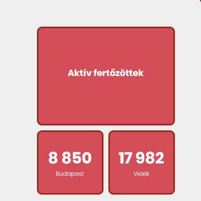 Az aktív fertőzöttek száma 26 832 fő. Az aktív fertőzöttek 33%-a, az elhunytak 46%-a, a gyógyultak 32%-a budapesti.