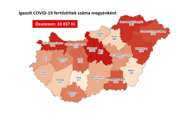 Regisztrált fertőzöttek száma, országosan: 38. 837 (változás +1173) fő