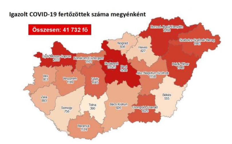 950 újabb magyar állampolgárnál mutatták ki az új koronavírus-fertőzést (COVID-19), ezzel 41 732 főre nőtt a hazánkban beazonosított fertőzöttek száma. Elhunyt 29 idős krónikus beteg, így az elhunytak száma 1052 főre emelkedett, 12 628-an pedig már meggyógyultak. Az aktív fertőzöttek száma 28 052 fő. 1555 koronavírusos beteget ápolnak kórházban, közülük 167-en vannak lélegeztetőgépen.