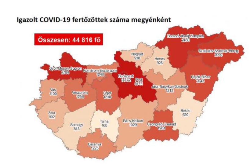 1791 újabb magyar állampolgárnál mutatták ki az új koronavírus-fertőzést (COVID-19), ezzel  44 816 főre nőtt a hazánkban beazonosított fertőzöttek száma. Elhunyt 24 idős, krónikus beteg, így az elhunytak száma 1109 főre emelkedett, 13 580-an pedig már meggyógyultak. Az aktív fertőzöttek száma 30 127 fő. 1693 koronavírusos beteget ápolnak kórházban, közülük 185-en vannak lélegeztetőgépen.