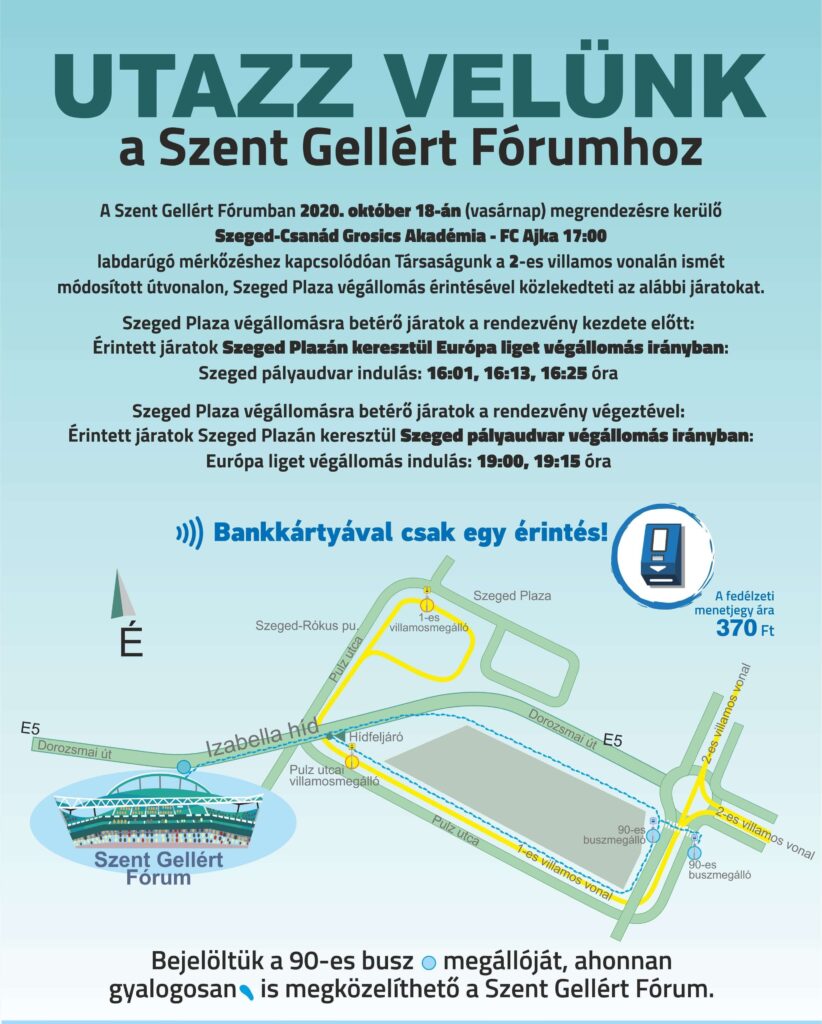 A Szegedi Közlekedési Társaság tájékoztatása szerint módosul a 2-es villamos útvonala a holnapi Szent Gellért Fórumban megrendezésre kerülő Szeged-Csanád Grosics Akadémia – FC Ajka mérkőzés kapcsán.