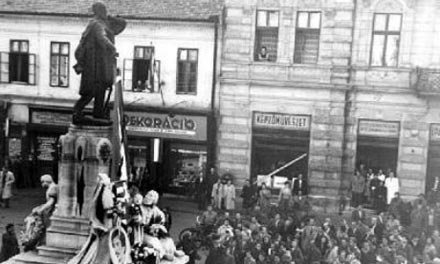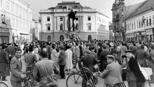 J.Cs.: Ahogy említettem, október 20-tól kezdve az Aud Max volt a forradalmi gócpont. Október 23-án is innen indulnak el a Dóm térre, ahol már 500-an voltak. Innen a Szegedi Nemzeti Színházba vitt a forradalmárok útja, itt pont előadás volt, az utcára hívták a nézőket és a színészeket, hogy együtt a Klauzál térre menjenek. Itt Kaló Flórián (későbbi Jászai Mari-díjas színész) elszavalta a Nemzeti Dalt, Bicskei Károly pedig a Szózatot. Még mindig megvan a Móra Ferenc Múzeumban a Kossuth címer, melyet egy Sztálin képre festettek rá, amit a színházból hoztak el. A 23-i, szegedi tüntetés abszolút békés volt, az eseményeket követően szépen hazamentek a résztvevők.